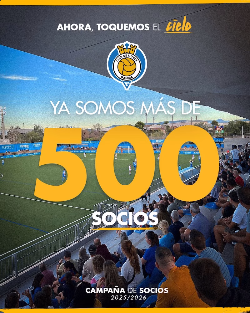 El CF Gandia ha superado la barrera de los 500 socios en la temporada 2025/2026, un hito que consolida el crecimiento social y deportivo de la entidad blanquiazul. La cifra, que ya mejora los registros de la pasada campaña, refleja la gran respuesta de la afición a la campaña de abonos “Ahora, toquemos el cielo”, lanzada el pasado mes de julio y que simboliza la ambición y el espíritu de superación del club.