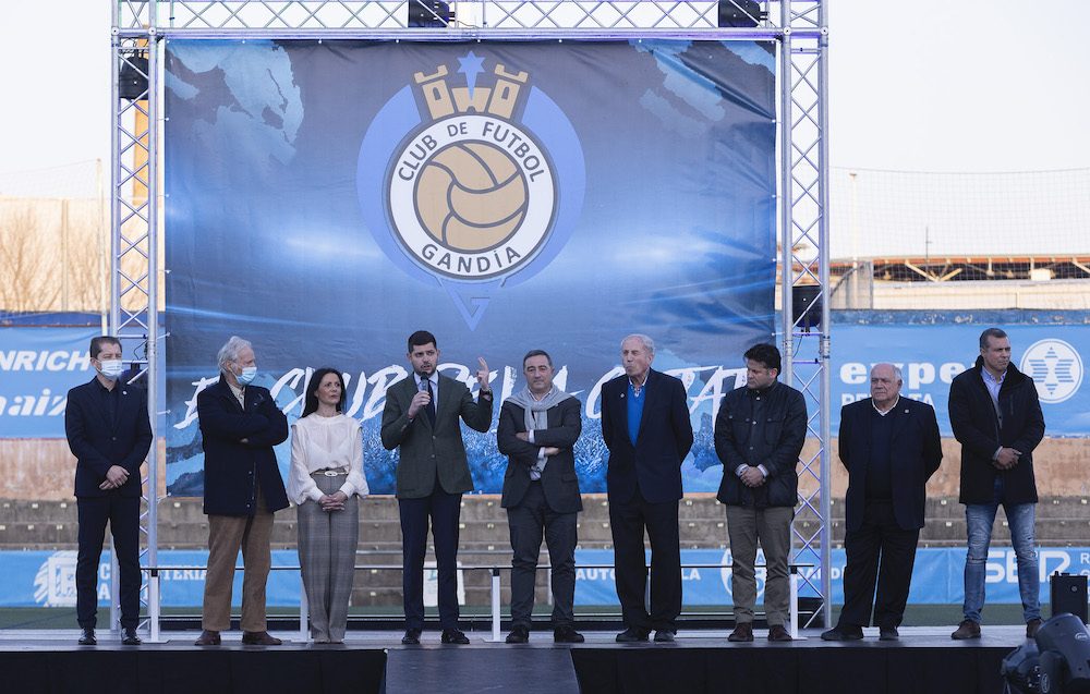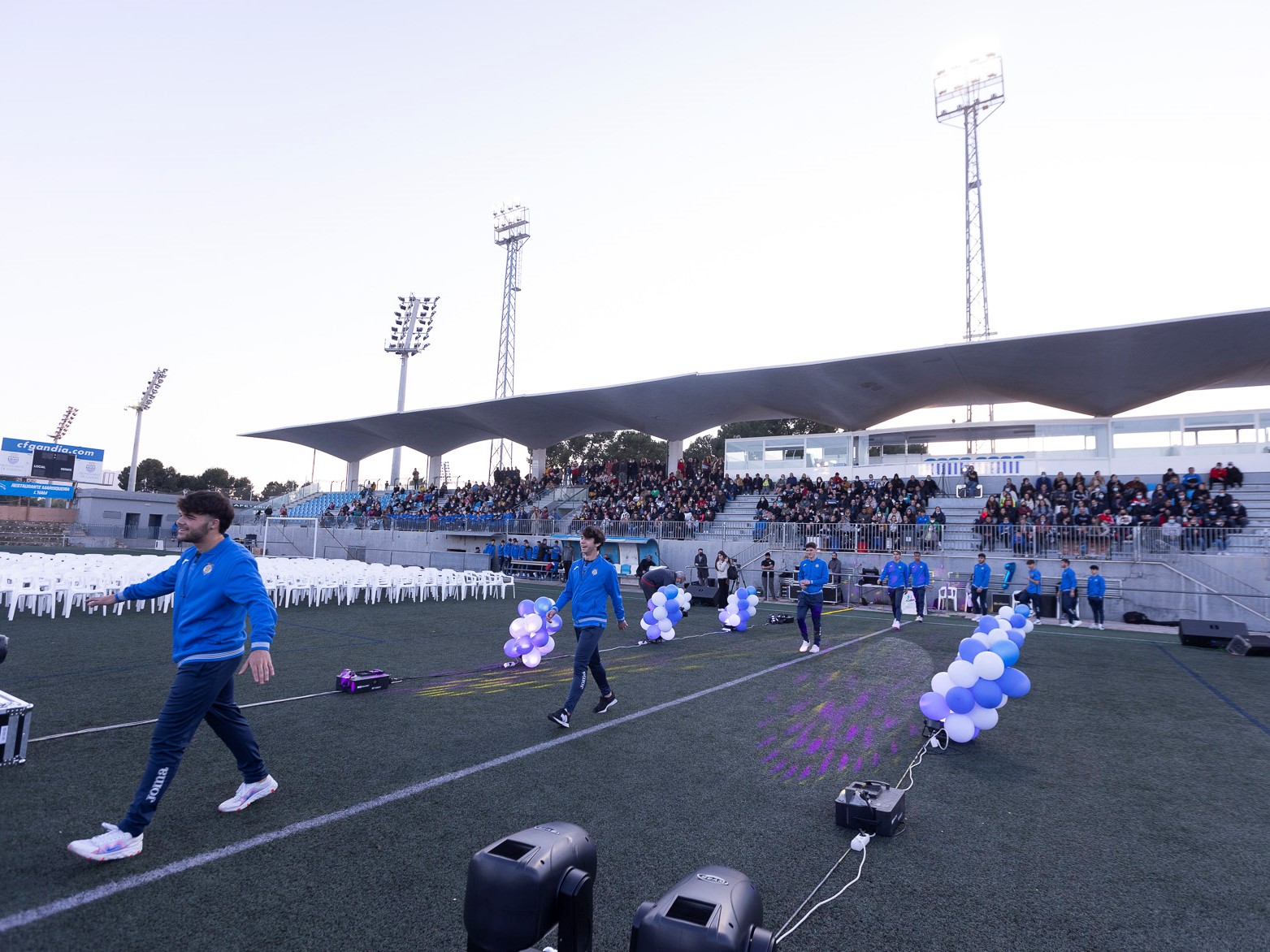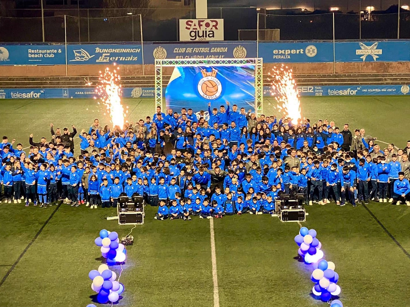 El Club de Fútbol Gandia reunió este miércoles en el estadio Guillermo Olagüe cerca de 450 niños y niñas de las 27 equipos que conforman la entidad en uno de los actos que esta realizando el club para celebrar su 75 aniversario.