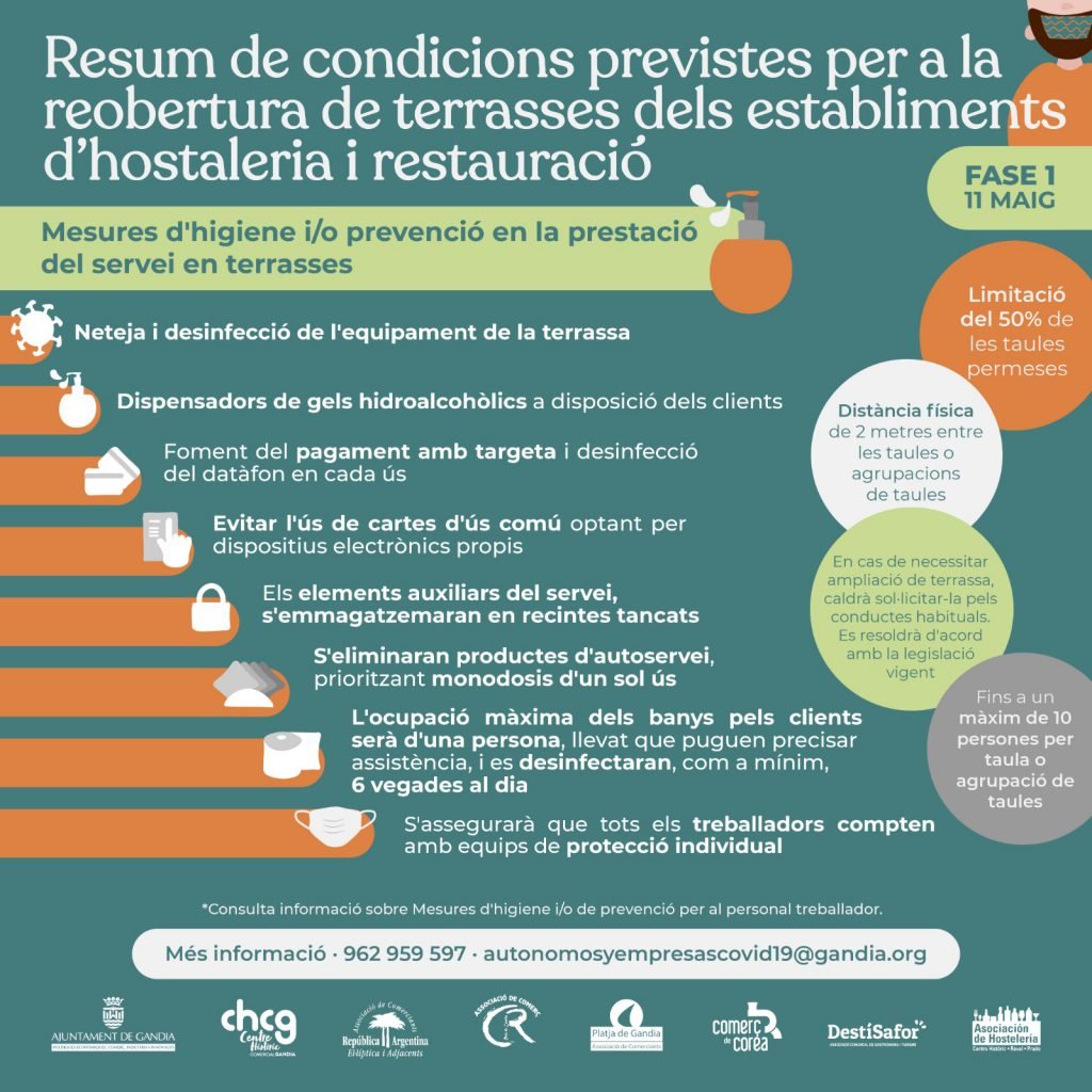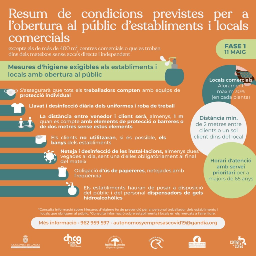 El lunes 11 de mayo Gandia se adentrará en la Fase 1 del plan de desescalada hacia la «nueva normalidad». En esta fase estará permitida la apertura de establecimientos y locales. Podremos ir a bares, restaurantes, terrazas, comercios… Tiempo de cambios que llevan aparejadas dudas para todos; empresarios, empleados y clientes: ¿cuál es el aforo permitido?, ¿puedo atender a varios clientes a la vez?, ¿qué medidas de higiene y protección debo adoptar?, ¿debo incorporar elementos de señalización de la distancia mínima y del aforo permitido?, ¿en qué condiciones puedo reiniciar la actividad de reformas en la construcción?.