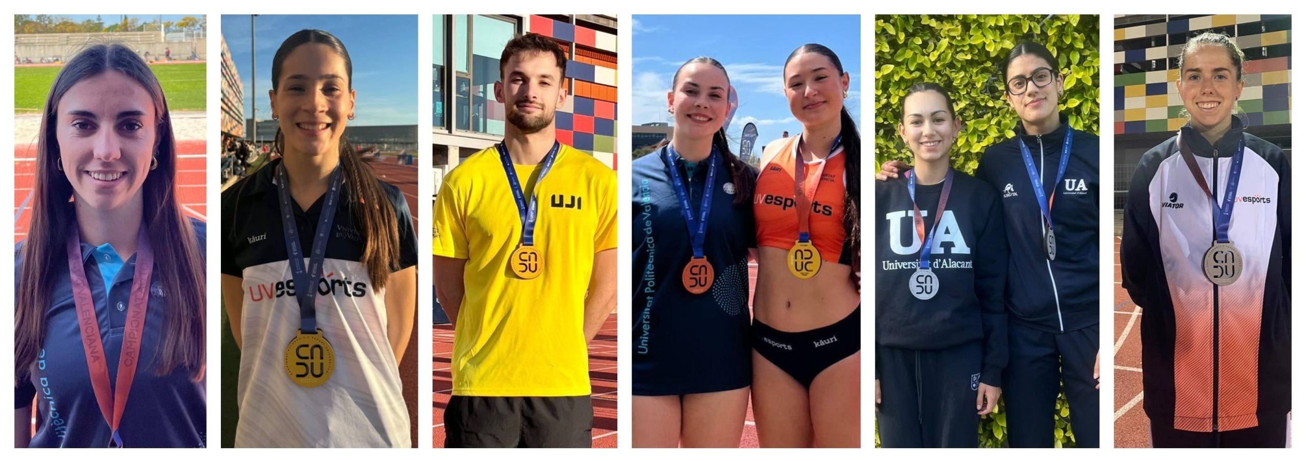 Se trata de Silvia García-Gasulla (UPV, oro en pértiga), Laura Castillo (Universitat de València, oro en los 200 ml), Pau Borillo (UJI, oro en los 110 metros vallas), Claudia Alriols (UPV, bronce en 100 ml), Camila Estrebou (UV, oro en 100 ml), Iris Estruch (Universitat d’Alacant, plata en 4×400 mixto), Stella Ortín (UA, plata en 3.000 metros obstáculos), Carla Breco (UV, plata en 5.000 ml), Camilla Pagani (Universidad Europea, plata en 400 ml), Borja Climent (UV, plata en jabalina), Neus Sansaloni (Universidad Católica de València, plata en 800 ml), María Huertas (UJI, bronce en triple salto), Mara Herrando (UJI, bronce en altura), Iván Albiol (UV, bronce en altura), e Iris Polo, de la UV, bronce en los 400 metros vallas.
