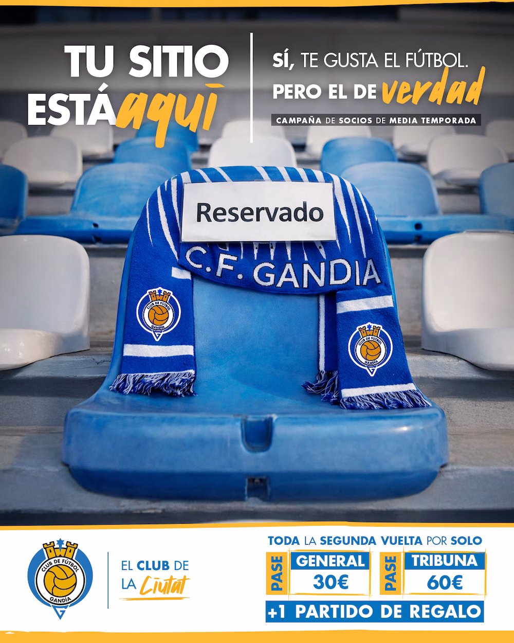El pase de media temporada incluye los ocho partidos de la segunda vuelta como local, en los que el C.F. Gandia buscará seguir haciéndose fuerte en casa. No en vano, el Guillermo Olagüe se ha convertido esta temporada en un auténtico fortín, con el equipo mostrando su mejor versión arropado por los suyos.