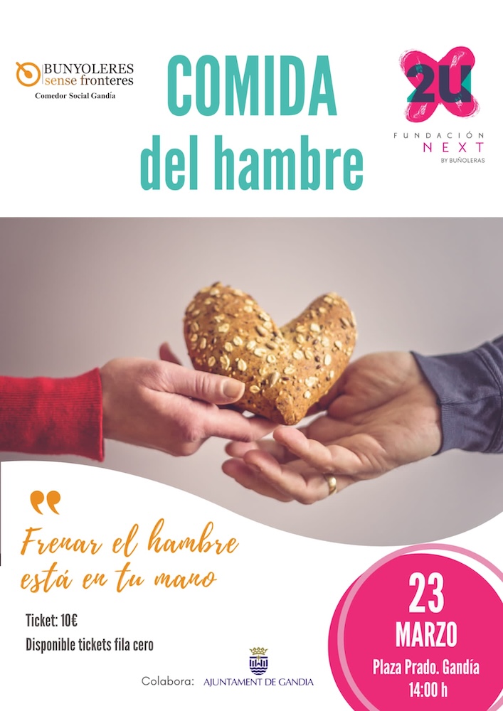 La Fundación Next2U by Buñoleras se ha organizado el evento benéfico Comida del Hambre, un evento que se llevará a cabo el próximo sábado 23 de marzo, a las 14 horas, en la plaza del Prado. El objetivo de esta acción solidaria es recaudar fondos para apoyar al Comedor Social de la ciudad.
