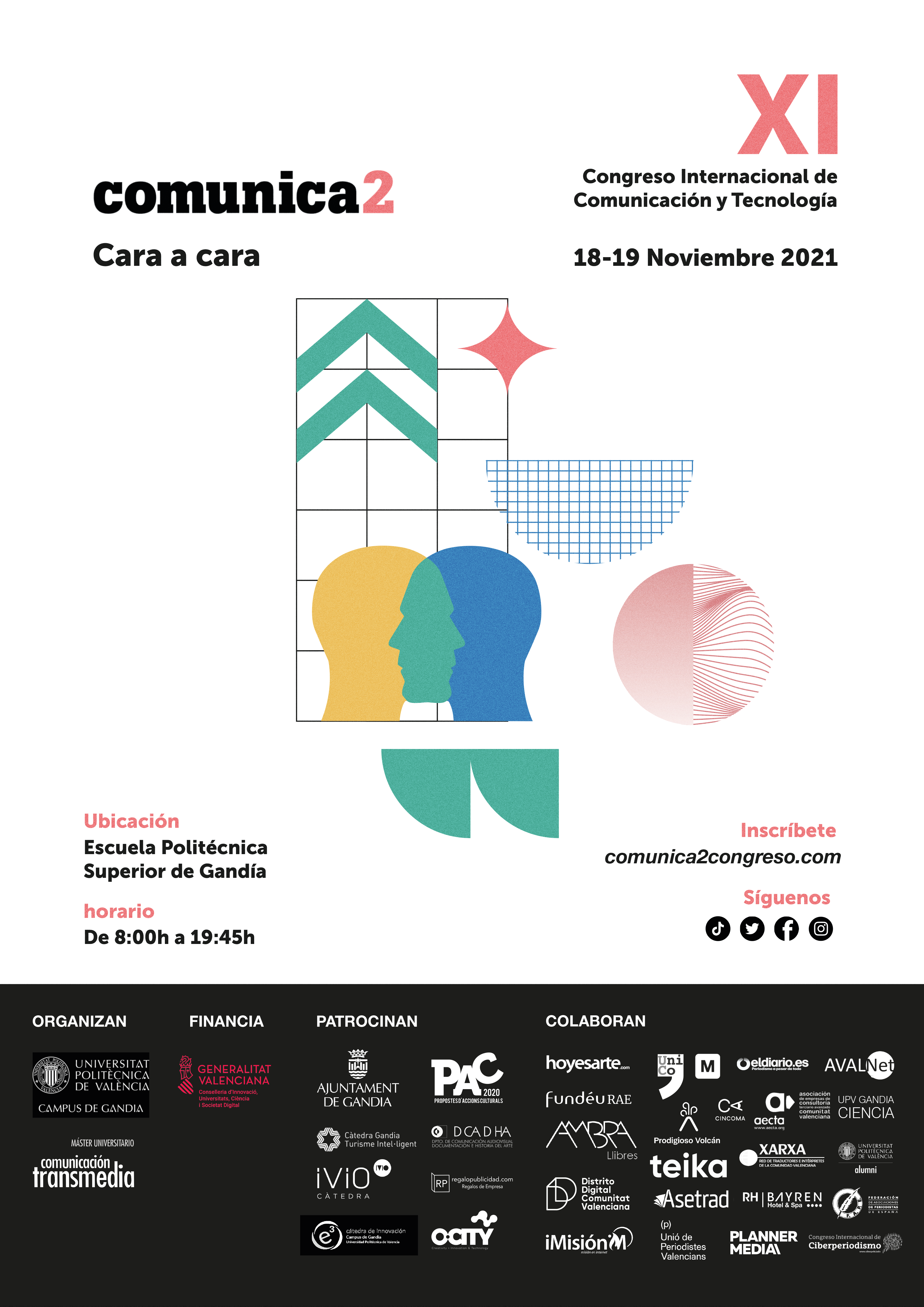 El Congreso Internacional de Redes Sociales Comunica2 celebra su XI edición de forma presencial tras su paso por el modo online debido a la pandemia. Los próximos días 18 y 19 de noviembre el Campus Universitario de Gandia acogerá a todos los asistentes bajo el título especial de este año, «Cara a cara».