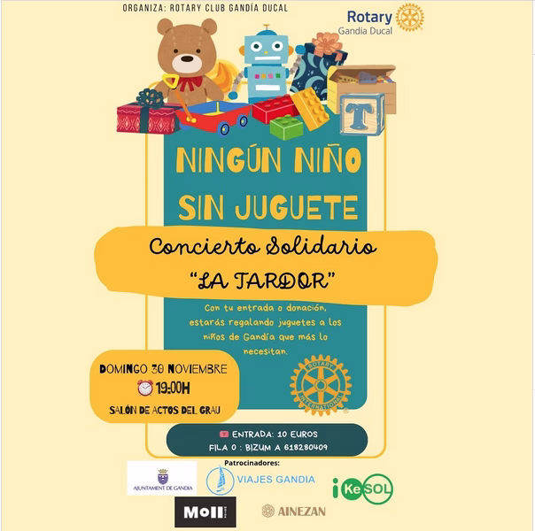 El Rotary Club de Gandia, con la colaboración del Ayuntamiento, ha presentado hoy el concierto solidario ‘Ningún niño sin juguete’, una iniciativa que busca que los menores en situación de vulnerabilidad puedan disfrutar de la Navidad con ilusión. La actividad tendrá lugar este domingo 30 de noviembre a las 19:00 horas en el Salón de Actos del Grau.
