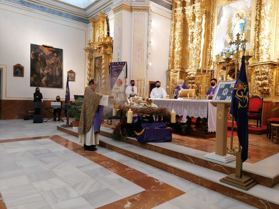 La iglesia de Sant Roc-Beato acogió la bendición de la nueva talla del Cristo Yacente en su traslado al Sepulcro. La bendición fue realizada por D. Vicente Fontestad, Vicario General, junto con el Consiliario el P. José Luis Miravet S.J., que asistió como concelebrante.