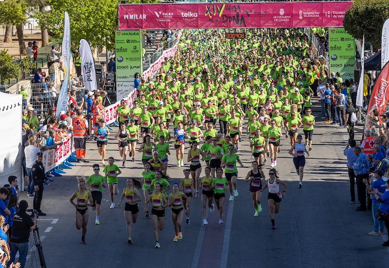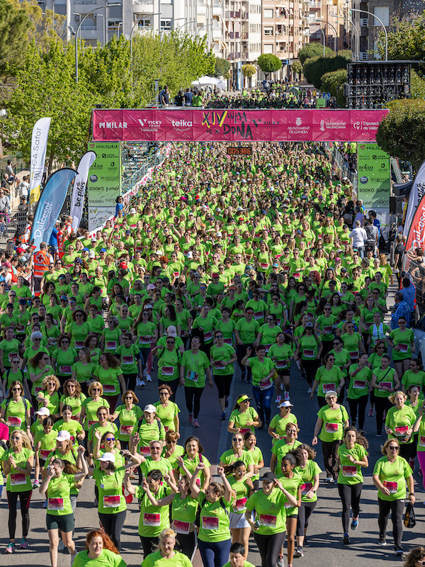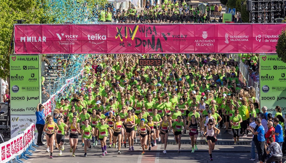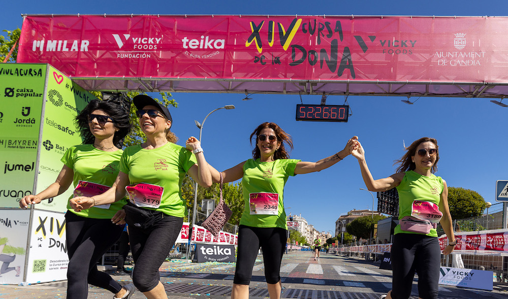 Miles de mujeres de todas las edades tomaron este domingo las calles de Gandia y Benirredrà en la decimocuarta edición de la Cursa de la Dona Vicky Foods, en una mañana soleada y con una temperatura máxima de 25 grados.