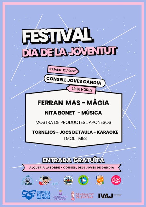 Además, desde el Consejo de los Jóvenes de Gandia se ha organizado dentro del programa ‘Noches al aire libre’ la fiesta de la Juventud en la Alquería Laborde. Animamos a los jóvenes a venir y disfrutar del Festival con magia de la mano de @ferranmas_ilusionista, música de @nita.bonet y muestra de productos japoneses @elius.store, torneos, juegos de mesa, karaoke y mucho más.