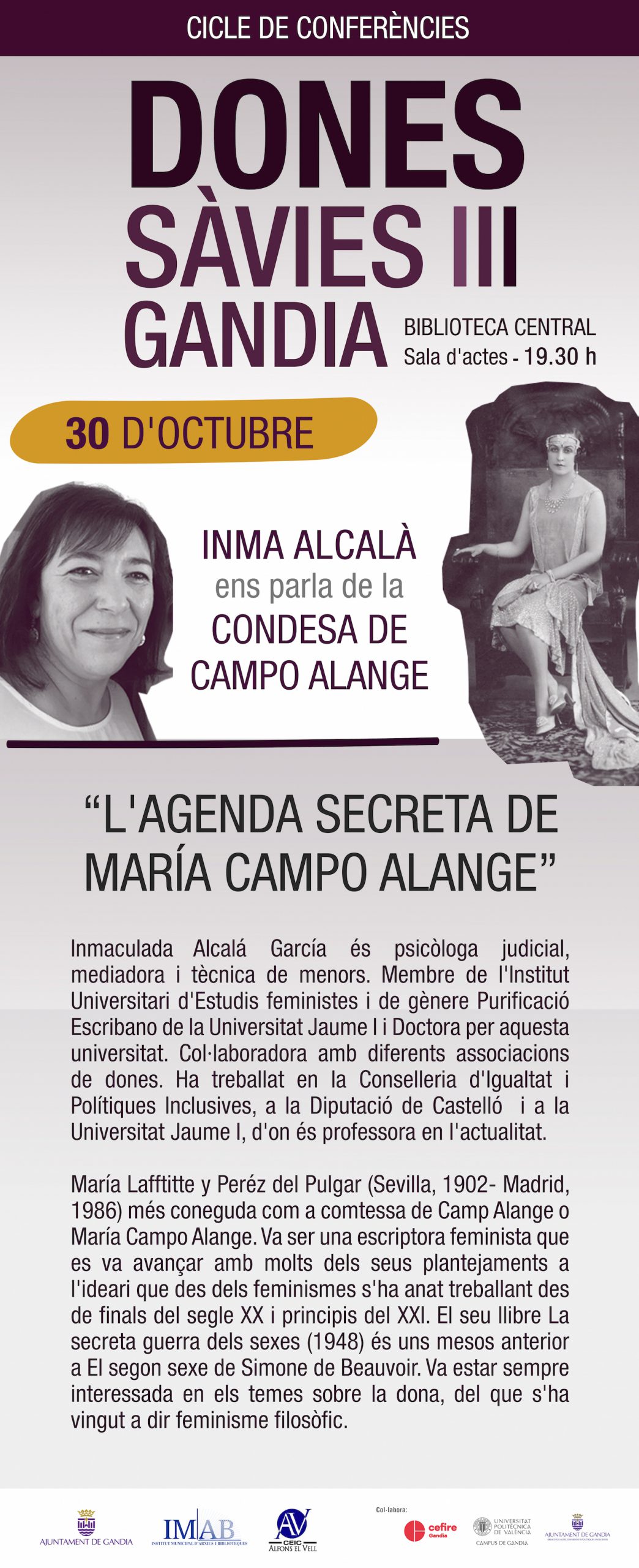La nova edició del programa «Dones Sàvies» comença amb huit conferències per davant. Amb la col·laboració del CEIC Alfons el Vell i la regidora d’Igualtat, huit dones analitzaran la trajectòria de dones que han marcat una part imoprtant de la seua vida. Un projecte que tracta de visibilitzar l’acció de les dones, moltes voltes ocultades injustament al llarg de tota la història.