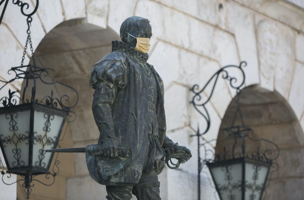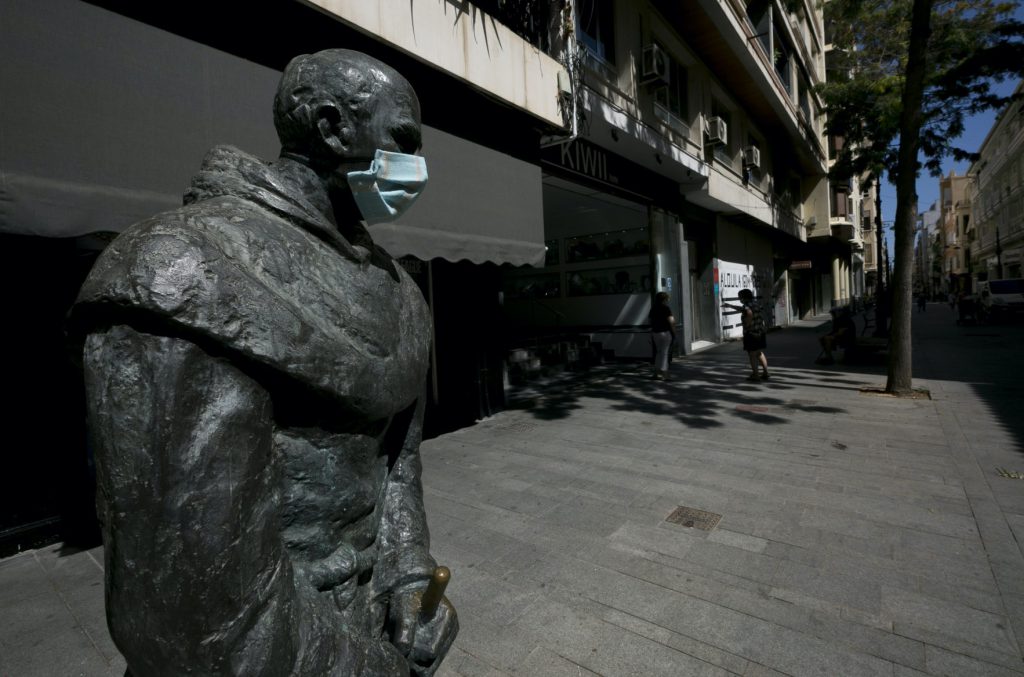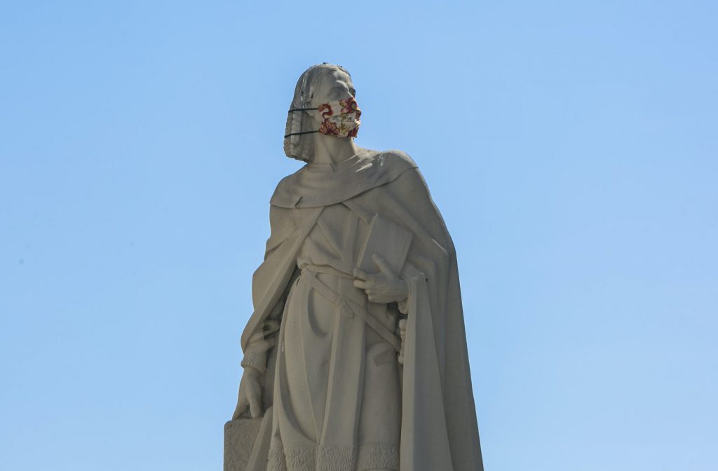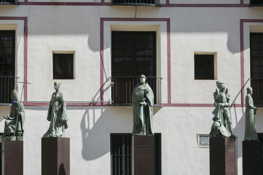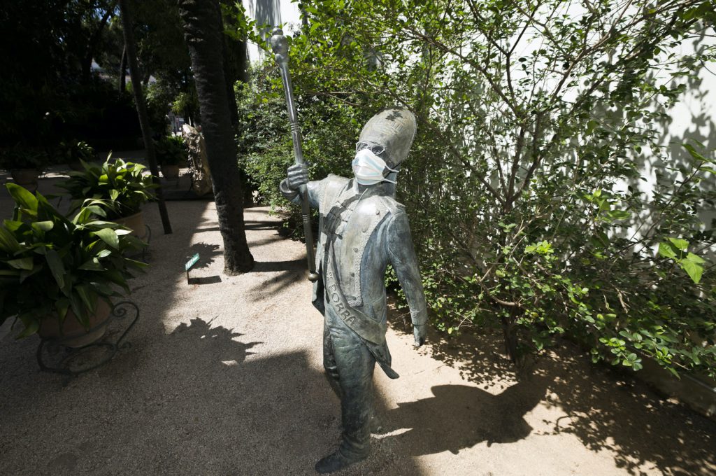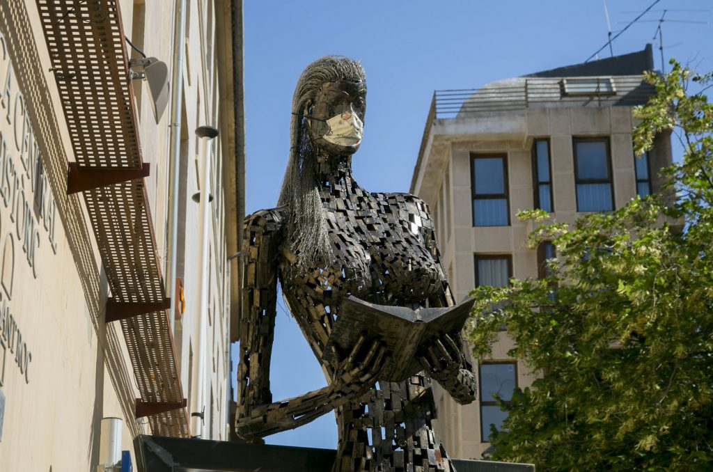 Buena parte de las esculturas de Gandia lucen desde este viernes su correspondiente mascarilla con el objetivo de recordar a la ciudadanía que hay que protegerse del COVID-19. La familia Borja de la plaza Escola Pia, la ‘Lectora Impaciente’ de la Biblioteca Central, el Tío de la Porra de la Casa de la Marquesa, María Enríquez o Ausiàs March, entre otros, de manera simbólica, también cumplen con la obligación de ponerse la mascarilla para evitar la propagación del COVID-19, mascarillas que han sido realizadas por los voluntarios que han suministrado cientos de unidades a los vecinos de Gandia desde el inicio de la pandemia.