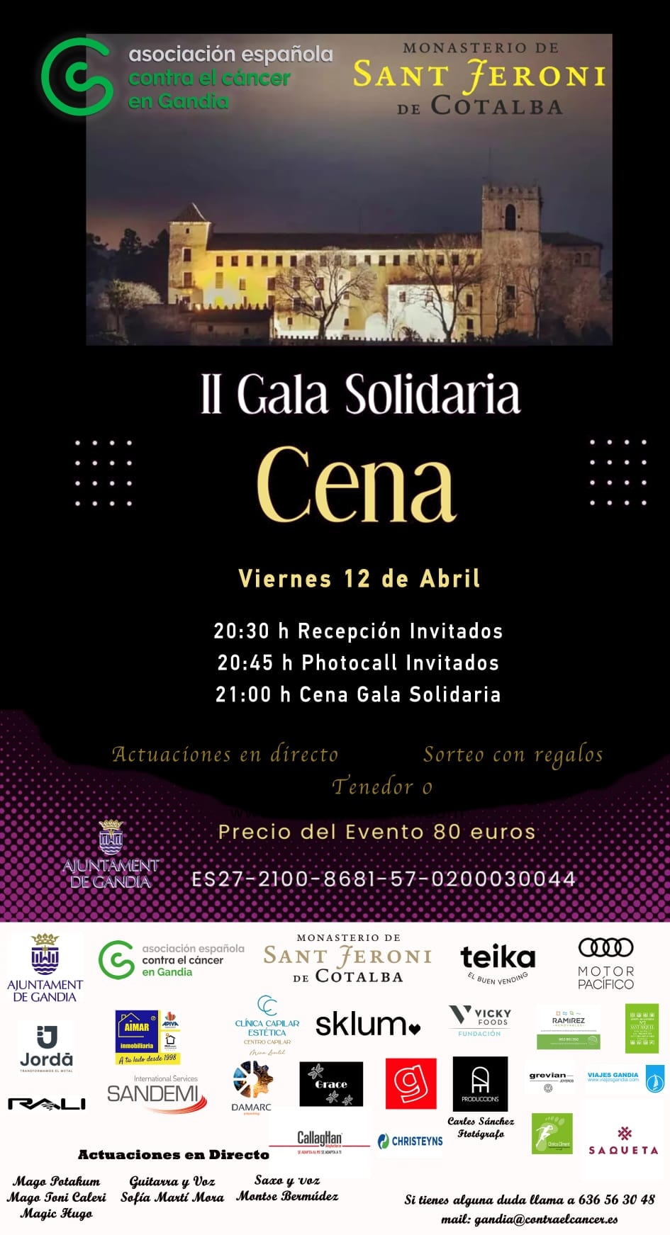 En Gandia se llevará a cabo la segunda edición de la Gala Solidaria, un evento de la Asociación Española Contra el Cáncer (AECC) que se celebrará el próximo viernes 12 de abril en el Monasterio de Sant Jeroni de Cotalba.