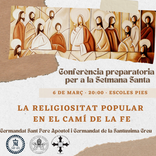 La conferencia se realizará el miércoles 6 de marzo a las 20:00 horas en la Iglesia de las Escuelas Pías. El escolapio P. Enric Ferrer Solivares impartirá dicha conferencia, que estará abierta a cofrades y público en general.