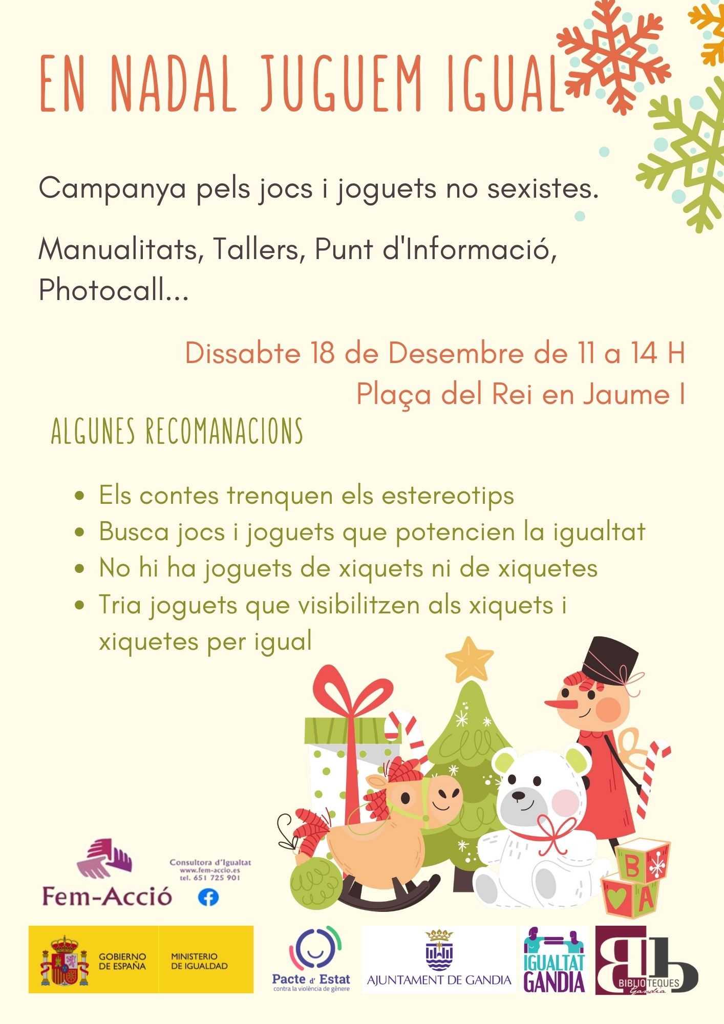 El consistori convida a tota la ciutadania a participar el dissabte dia 18 de desembre als Tallers «En Nadal juguem Igual», que tindran lloc d’11.00 h a 14.00 h a la plaça del Rei en Jaume I per a posar en pràctica consells sobre aquesta qüestió. Els més menuts i menudes podran gaudir d’activitats com tallers pinta caretes, un divertit photocall, un arbre dels desitjos, i un punt informatiu amb algunes recomanacions per a aquest Nadal.