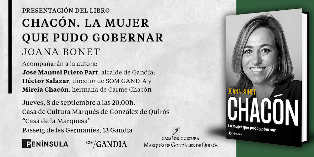La Casa de la Marquesa de Gandia acoge este jueves 8 de septiembre a las 20:00 horas la presentación del libro ‘Chacón. La mujer que pudo gobernar’ de la autora Joana Bonet, en el que se repasa el recorrido vital y político de Carme Chacón.