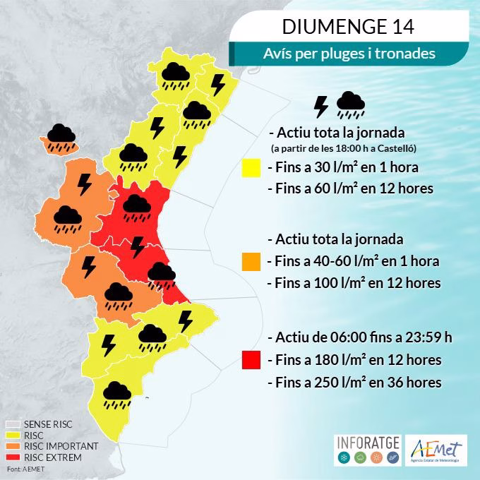 El Centro de Coordinación de Emergencias de la Generalitat Valenciana y AEMET han activado para este domingo 14 de diciembre la alerta roja por lluvias y tormentas en todo el litoral de la provincia de Valencia, motivo por el que el Ayuntamiento de Gandia ha acordado medidas preventivas tras la reunión del CECOPAL con responsables políticos, técnicos municipales, Policía Local y Protección Civil. Asimismo, el Consorcio de Bomberos de Valencia ha reforzado su dispositivo ante el episodio de inestabilidad meteorológica previsto.