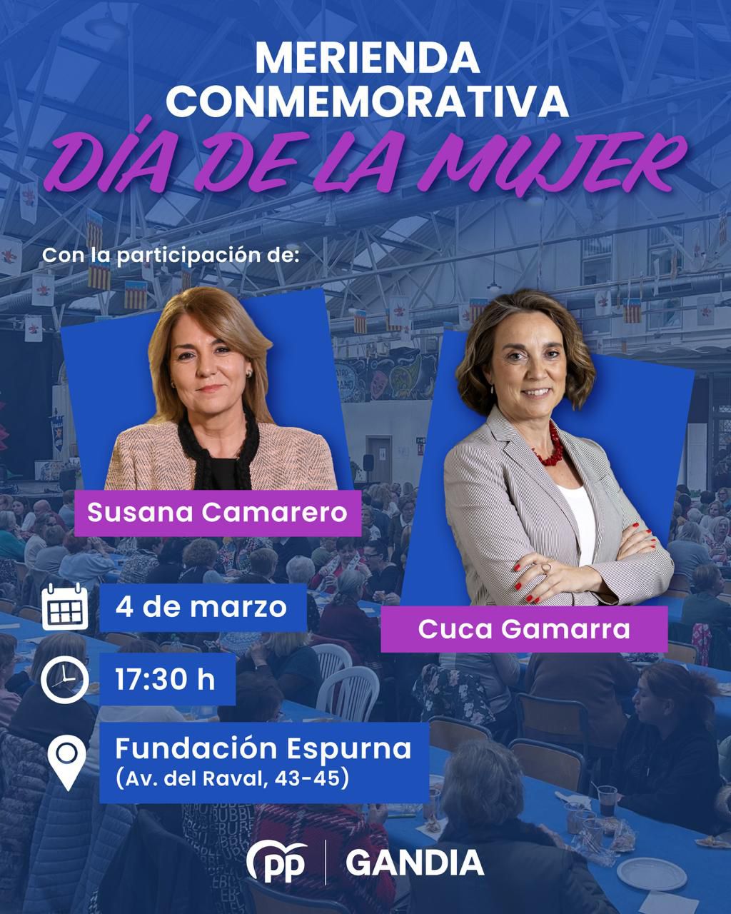 El Partido Popular de Gandia celebrará mañana, miércoles 4 de marzo, a las 17:30 horas, una merienda con motivo del Día Internacional de la Mujer. El acto tendrá lugar en la Fundación Espurna y está abierto a todas las mujeres de Gandia.