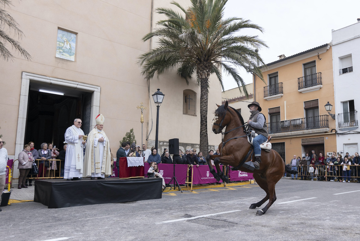 El alcalde de Gandia, José Manuel Prieto, junto al presidente de la Junta de Distrito, Jesús Naveiro, y otros representantes municipales, visitaron el Porrat y participaron en la tradicional bendición de animales.