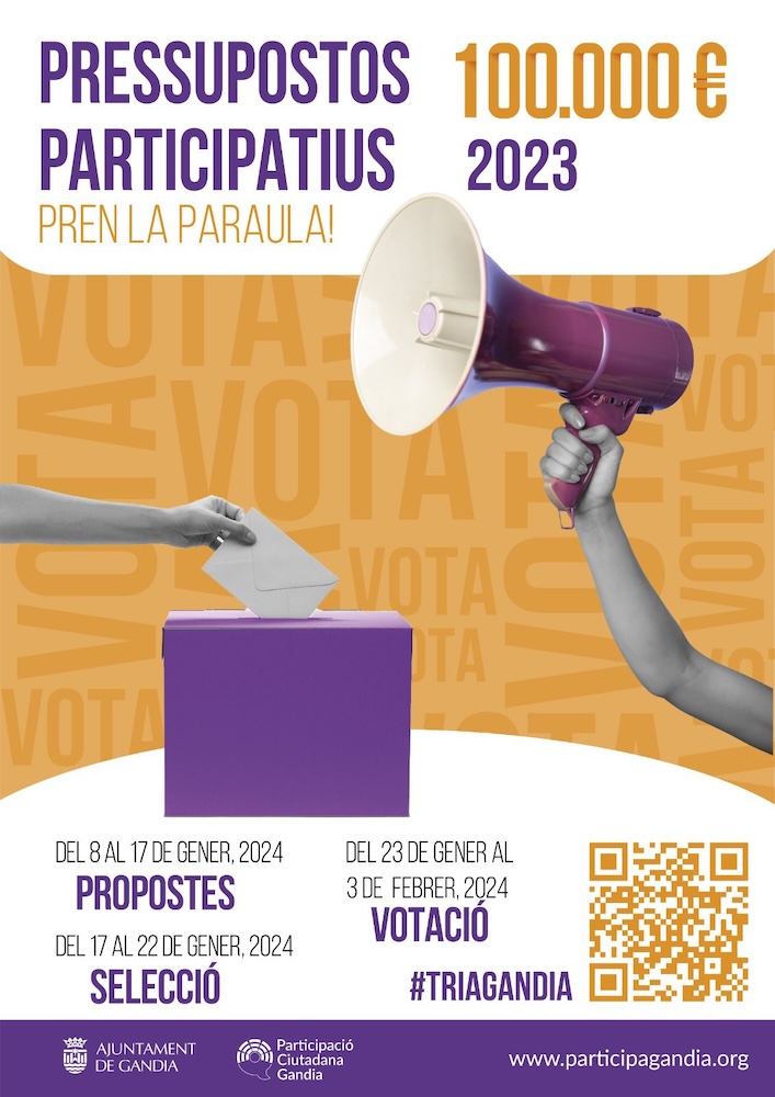 El proceso de participación comenzará el 8 de enero y finalizará el día 17 del mismo mes. La ciudadanía y colectivos que lo deseen podrán presentar sus propuestas, dentro de ese plazo, a través de la web de Participa Gandia.
