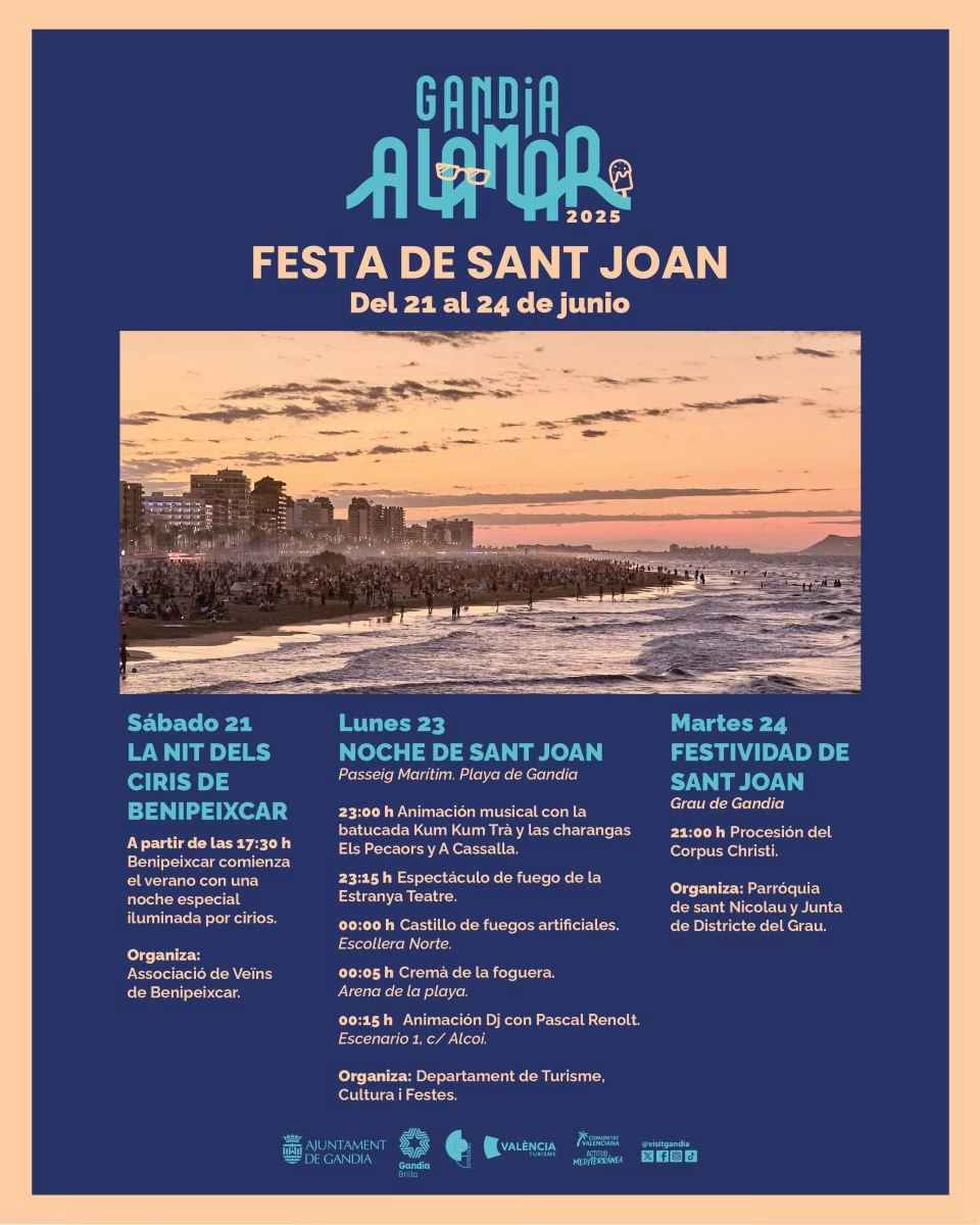 Gandia se prepara para celebrar la Noche de San Juan 2025 con una programación repleta de actividades culturales y festivas. El programa, impulsado por el Departamento de Turismo, Cultura y Fiestas del Ayuntamiento de Gandia, incluye música, espectáculos pirotécnicos y actos tradicionales.