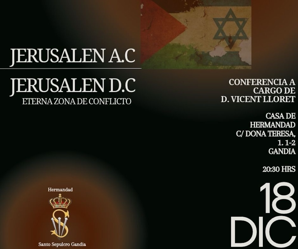 El próximo lunes, 18 de diciembre, la Hermandad del Santo Sepulcro de Gandia se reúne para celebrar la onomástica de la Virgen de la Esperanza en la Resurrección con un evento tradicional y significativo. Este año se ha programado una conferencia titulada Jerusalén A.C, Jerusalén D.C. Eterna zona de conflicto, a cargo de Vicent Lloret, con el objetivo de arrojar luz sobre uno de los conflictos más relevantes en la sociedad actual.