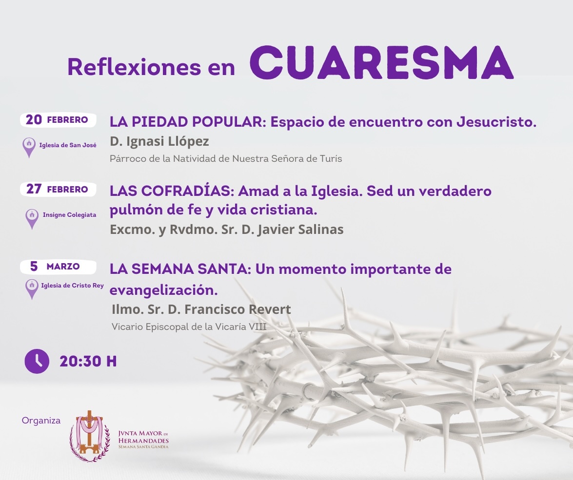 La Junta Mayor de Hermandades de la Semana Santa de Gandia ha organizado un nuevo ciclo de Reflexiones en Cuaresma con el que preparar durante el periodo de cuaresma la llegada de los días que rememoran la pasión, muerte y resurrección de Jesucristo.