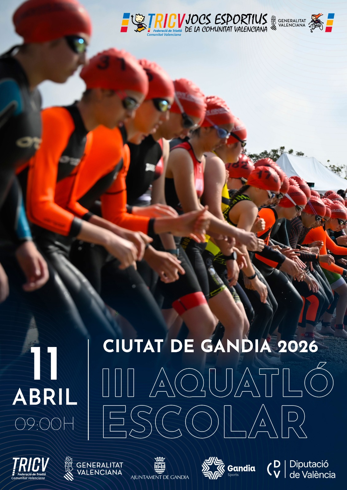 La jornada del sábado arrancará a las 9:00 horas con la tercera edición del Acuatlón Escolar, integrada en la fase autonómica de los Jocs Esportius, que contará con 233 jóvenes deportistas de categorías infantil, cadete y juvenil. Los participantes afrontarán distancias adaptadas a su edad, con tramos de entre 400 y 500 metros de natación y entre 1 y 2 kilómetros de carrera a pie.